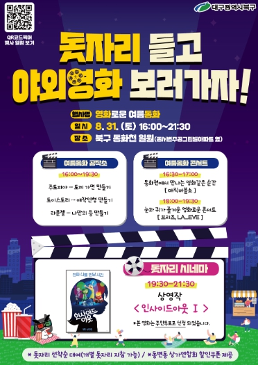 2017년부터 시작된 하천 정비사업을 통해 북구의 대표적인 친수공간으로 탈바꿈한 동화천에서,‘온 가족이 함께 즐길 수 있는 야외 영화관’콘셉트의 '영화로운 여름동화' 행사를 개최하여 긴 여름의 끝자락에 주민들을 맞이한다.