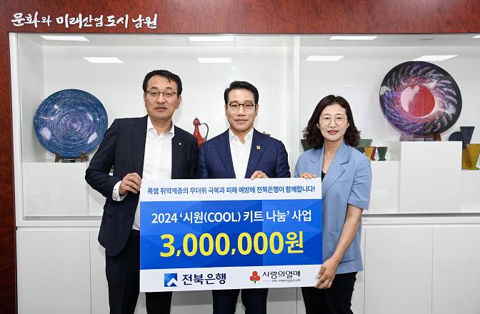 [뉴스서울] 남원시는 여름을 맞이하여 JB전북은행 남원지점에서 시원(COOL) 키트 70box(환가액 3백만원 상당)를 기탁했다고 밝혔다.