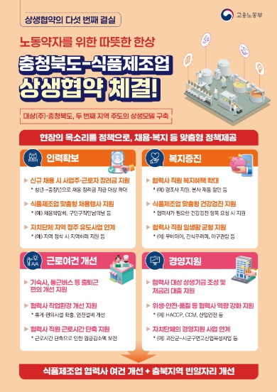 [뉴스서울] 충북지역의 식품제조업에서 원·하청의 상생과 협력의 밥상이 차려진다. 고용노동부는 24일 괴산 자연드림파크에서 충청북도, 진천군, 괴산군, 음성군, 대상(주) 및 협력사와 함께 ‘격차 완화와 약자 보호’를 위한 충청북도-식품제조업 상생협약을 체결했다.
