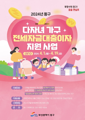 [뉴스서울] 25일 부산 동구는 다자녀 가구 전세자금 대출이자 지원 사업을 추진한다고 밝혔다.