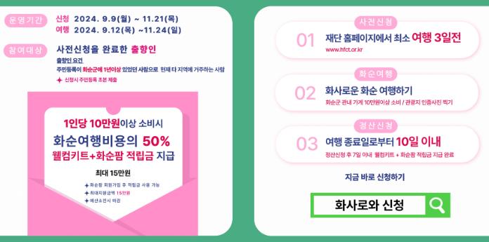 최소 여행 3일 전 사전 신청을 하고 여행 종료 10일 이내에 정산신청을 해야 한다. (정산신청 시 화순 관광지 2곳 이상을 방문한 인증사진과 화순 지역 내에서 지출한 영수증을 이메일로 제출하면 된다.)