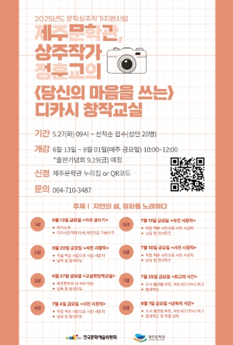 강의는 6월 13일부터 8월 1일까지 매주 금요일 오전 10시에 제주문학관 3층 세미나실에서 진행된다. 총 8회차로 회당 2시간씩 운영하며, 강의 종료 후에는 참여자들의 작품을 엮어 공동도서 ‘디카시집’으로 출간할 예정이다.