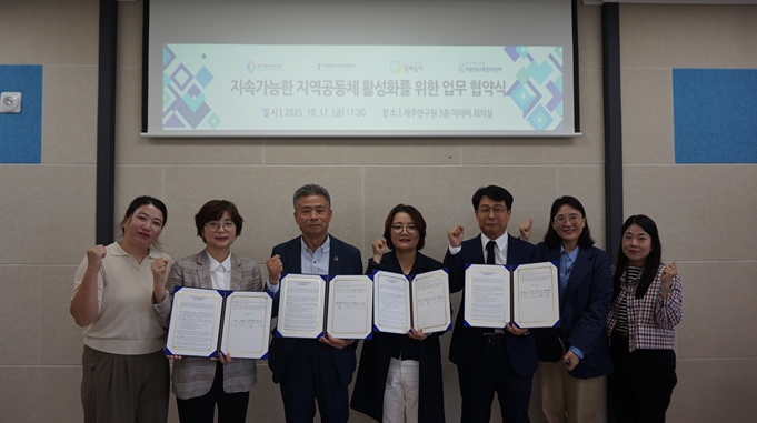 [뉴스서울] 제주연구원(원장 유영봉) 제주사회복지연구센터(센터장 오윤정)는 2025년 10월 17일, 지속가능한 지역공동체 활성화를 위해 제주특별자치도 지속가능발전협의회, 일배움터, 제주특별자치도 마을만들기종합지원센터와 업무협약을 체결했다.