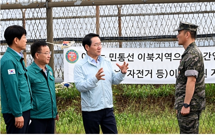 ▲ 유정복 인천광역시장이 9월 18일 강화군 송해면 당산리 대남 소음방송 현장을 찾아 군관계자로부터 현황을 보고받고 현장을 점검하고 있다. |