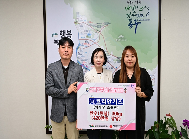 ▲ 사단법인 코리안키즈(이사장 조용란)는 지난 5월 30일, 30kg 한우 등심(420만원 상당)을 동구청에 기탁했다. |