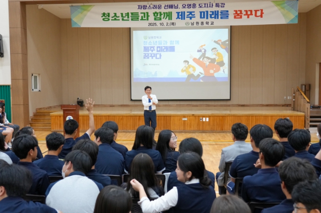 [뉴스서울] 오영훈 제주특별자치도지사는 2일 남원중학교(교장 오경석)를 찾아 전교생을 대상으로 특별강연을 열고, “남원과 제주를 넘어 아시아, 나아가 우주까지 여러분의 무대가 돼야 한다”며 청소년들의 꿈과 도전을 격려했다.