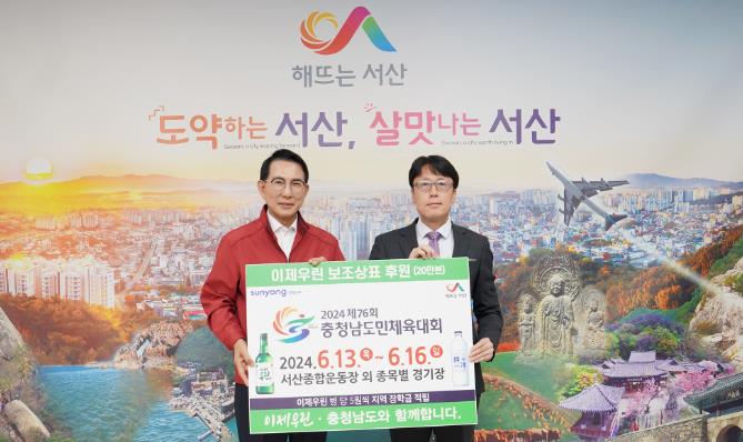 [뉴스서울] 충남 서산시가 25일 ‘2024 제76회 충청남도민체육대회’의 성공적인 개최를 위해 ㈜선양소주와 소주 홍보 보조라벨 전달식을 개최했다고 밝혔다.