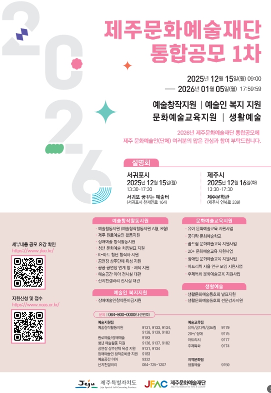[뉴스서울] 제주문화예술재단(이사장 김석윤)은 2026년도 지원사업 1차 통합공모를 실시한다. 접수 기간은 2025년 12월 15일부터 2026년 1월 5일까지이며, 문화예술교육 지원사업은 2026년 1월 9일까지 접수한다.