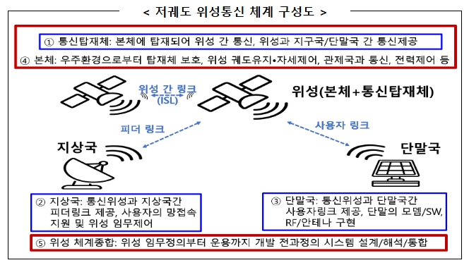 ‘저궤도 위성통신 기술개발’ 사업은 저궤도 통신위성[2기]과 지상국·단말국으로 구성된 저궤도 위성통신 체계 1식을 개발하는 것으로서 이번 사업을 통해 위성과 지상간, 위성과 위성간 통신기능을 수행하는 통신탑재체, 지상국, 단말국, 이를 보조하는 본체와 위성 체계종합 등으로 개발할 예정이다.