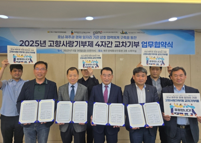 [뉴스서울] 제주경제통상진흥원(원장 오재윤)과 호남권(전남, 전북, 광주) 경제·일자리기관이 업무 연계와 협력을 통한 지역 경제 활성화를 도모하고, 상호 기부문화 확산에 기여하기 위한 고향사랑기부제 4자간 교차기부를 진행하기로 약속했다고 30일 밠혔다..