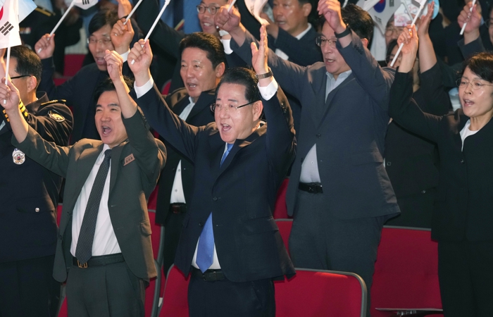 ▲ 김영록 전라남도지사가 15일 도청 김대중강당에서 열린 ‘제80주년 광복절 경축식’에 참석해 독립유공자 후손, 기관 단체장 등 참석자들과 광복절 노래 제창 및 만세삼창을 하고 있다. |