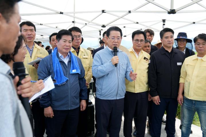 ▲ 김영록 전라남도지사가 14일 조생벼 수확이 한창인 고흥 포두면 들녘을 찾아 관계자로부터 벼 작황과 농가 애로사항을 청취하며 격려하고 있다. |