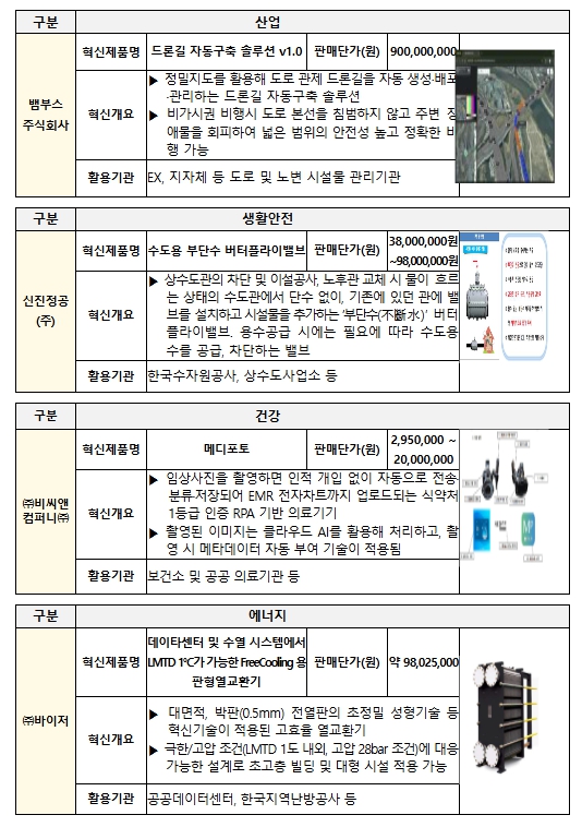 중기부는 2025년에 정밀지도를 활용해 도로 관제 드론길을 자동 생성・배포・관리하는 ‘드론길 자동구축 솔루션’, 상수도관의 차단 및 이설공사, 노후관 교체 시 수도관 단수 없이 기존에 있던 관에 밸브를 설치하고 시설물을 추가하는 ‘수도용 부단수 버터플라이밸브’ 등 총 95개의 우수 제품을 혁신제품으로 지정했다.