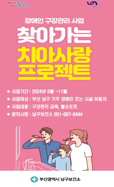 [뉴스서울] 부산 남구는 8월부터 11월까지 장애인의 건강한 구강관리를 위한 '찾아가는 치아사랑 프로젝트'를 운영한다.