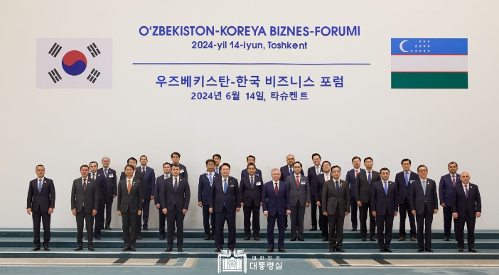 ▲ 6월 14일 윤석열 대통령은 샤브카트 미르지요예프 우즈베키스탄 대통령과 함께 한-우즈베키스탄 비즈니스 포럼에 참석했다. |