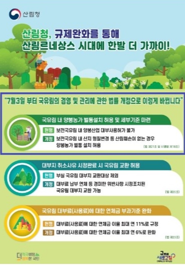 그동안 보전국유림 내에서는 벌통 설치가 불가했으나 양봉산업 활성화 및 국민소득 증대를 위해 산림훼손이 없는 범위 내에서 벌통을 설치할 수 있도록 법률이 개정됐다.