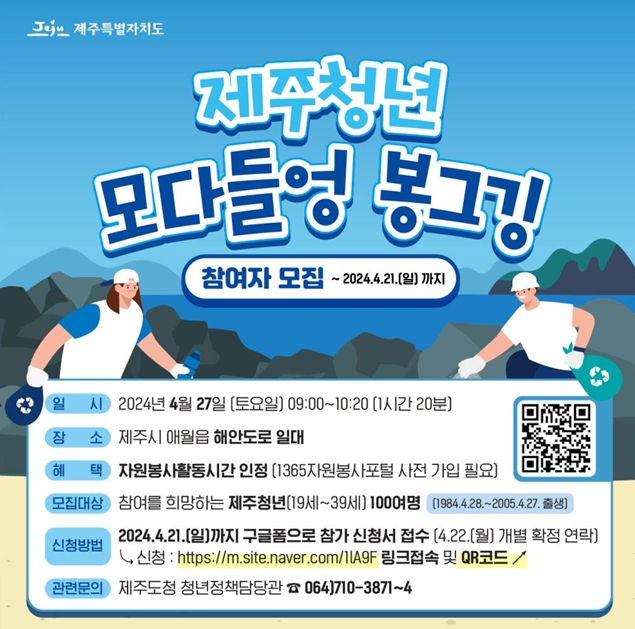 [뉴스서울] 제주특별자치도는 오는 27일 오전 9시 애월읍 해안도로 일원에서 진행하는 ‘제주청년 모다들엉 봉그깅’에 참여할 청년 100여명을 모집한다.