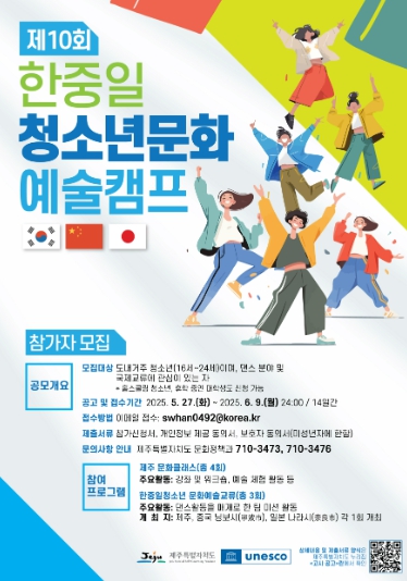 [뉴스서울] 제주특별자치도는 ‘제10회 한중일 청소년문화예술캠프’에 참여할 도내 청소년 20명을 오는 27일부터 6월 9일까지 모집한다.