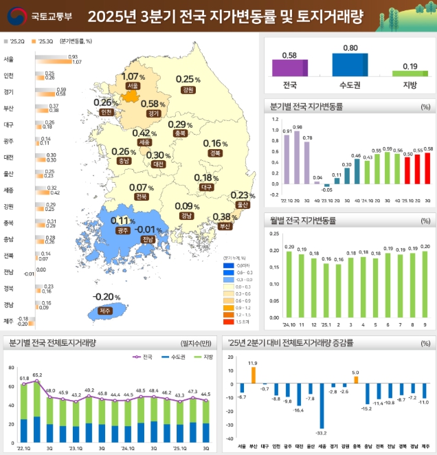[뉴스서울] 국토교통부와 한국부동산원(원장 손태락)은 '25년 3분기 지가변동률 및 토지거래량을 발표했다.