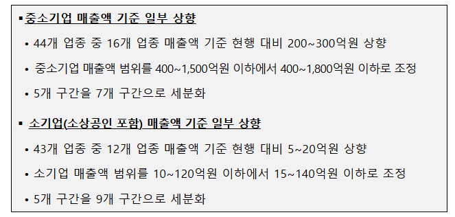 이에, 중기부는 중소기업 매출액 기준을 합리적으로 조정하기 위해 업계, 이해관계자 의견수렴과 관계부처, 학계, 전문가 등 논의를 거쳐 중소기업 44개 업종 중 16개, 소기업 43개 업종 중 12개 업종의 매출액 기준을 상향했으며, 그 후속절차로 중소기업기본법 시행령 개정안이 국무회의에서 의결되어 오는 9월 1일부터 시행될 예정이다.