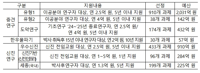 한편, 과기정통부는 어려운 경제 여건과 연구 현장의 예측 가능성 제고 등을 위해 이번에 선정된 1,880개 신규과제를 비롯, 계속과제 5,700여개의 2025년 연구비 1조 3천 6백억원을 2월중 신속히 집행할 예정이다.
