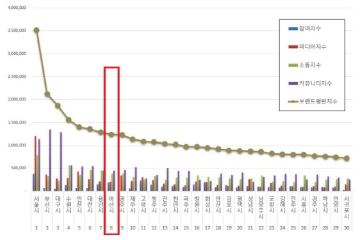 이번 4월 조사에서 아산시는 참여지수 193,112, 미디어지수 206,625, 소통지수 386,078, 커뮤니티지수 455,808로 종합 브랜드 평판지수 1,241,623으로 전체 8위에 랭크됐다.