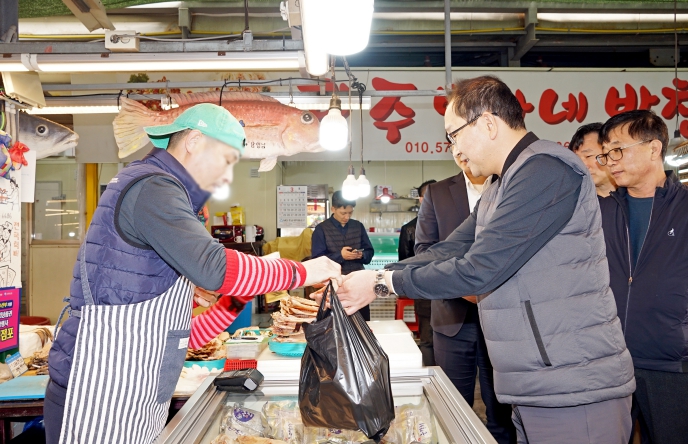 강 시장은 이날 민속오일시장에서 직접 국내산 수산물을 구매하고 온누리 상품권을 환급받았고, 시장을 찾은 방문객들에게 국내산 수산물 소비를 독려했다.