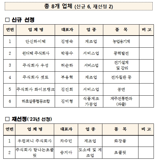 신규 선정된 6개 업체는 △첨단 초미립자 분사기술과 스마트 방제 시스템을 보유한 ‘안신하이텍 주식회사’ △ 풍력발전 전 주기에 걸친 전문성과 실적을 보유한 ‘윈디텍 주식회사’ △전기·통신·소방 분야의 풍부한 설계·감리 실적과 전문 기술력을 보유한 ‘주식회사 우성’ △스마트 교육기자재와 탄소중립 자원화 기술을 융합한 전문성을 기반한 ‘주식회사 젯트’ △제주 특화 콘텐츠를 지속 개발하고 제주 문화의 대외 확산에 기여한 ‘주식회사 화이브행크’ △ 제주 감귤과 전통 한과‘과즐’을 중심으로 6차 산업모델을 구축하고 국내외 판로 확대를 추진하는 ‘하효살롱협동조합’이다.