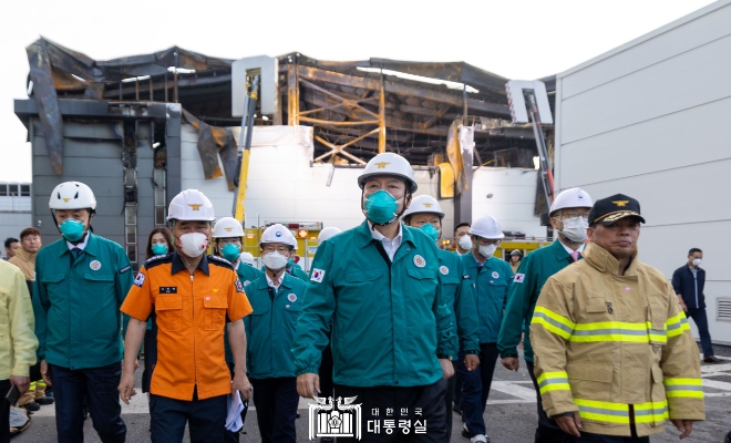 ▲ 6월 24일 윤석열 대통령은 경기도 화성시 배터리 제조공장에서 발생한 화재 현장을 방문해 피해 상황 및 대응 상황을 점검했다. |