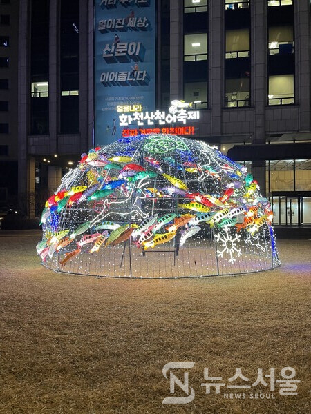 코로나19로 인해 2020년과 2021년에 이어 2022년 올해도 행사는 취소되었지만 산천어축제를 알리는 조형물이 프레스센터 앞 광장에서 화려한 불을 밝히고 있다.