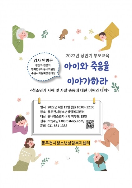 황상연 센터장은 “부모님께서 자녀와 죽음에 관해 이야기하는 것이 다소 불편하고 거부적인 생각이 들 수 있다고 생각한다 하지만 처한 어려움을 해소할 방법을 알지 못한 채 극단의 생각과 행동을 선택하는 청소년들이 증가하고 있는 것도 사실이다”며 “이번 교육은 청소년의 위기 행동을 이해하고 회복을 돕기 위해 마련된 자리인 만큼 관심을 가지고 참여해 주시기를 바란다”고 전했다.