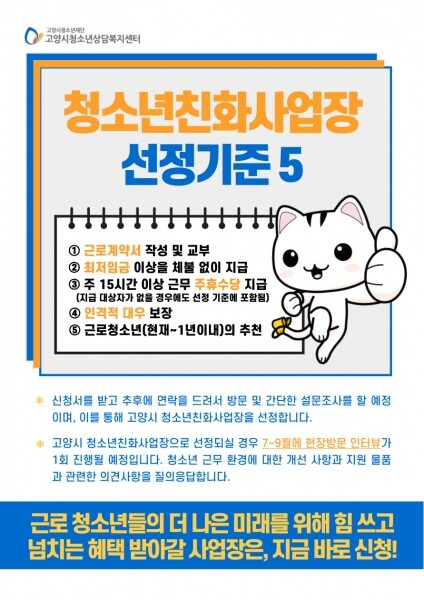 청소년친화사업장 모집은 6월 13일까지이며 신청대상은 고양시 만 24세 이하 근로청소년을 고용하고 있는 고양시 관내 사업장으로 관심 있는 곳은 홈페이지에서 신청서를 작성해 이메일 제출하면 된다.