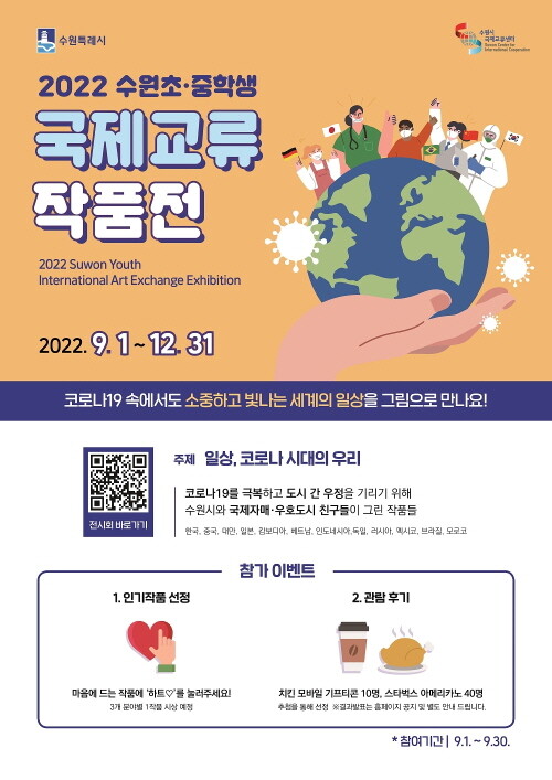 ‘2022년 수원 초·중학생 국제교류 작품전’ 공식 홈페이지에서 수원시를 비롯한 국제 자매·우호 도시 초·중학생이 ‘일상, 코로나 시대의 우리’를 주제로 그린 미술 작품 500점을 전시한다.
