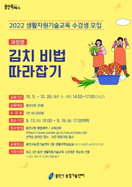 센터 관계자는 “김장철에 앞서 김장에 대한 시민들의 부담을 덜어드리기 위해 강좌를 준비했다”며 “시민들의 많은 관심을 바란다”고 말했다.