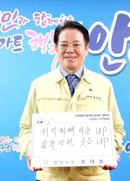 안양시는 최 시장을 필두로 ‘지역경제 살리는 지역화폐 사용 함께해요 릴레이 챌린지’를 시작했다고 7일 밝혔다.