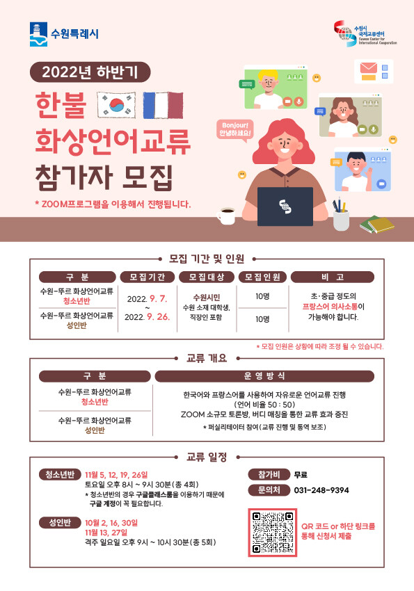 수원시민, 프랑스 뚜르시 시민 각 10명이 온라인 화상회의 플랫폼을 이용해 한국어와 프랑스어를 구사하며 언어교류를 하는 프로그램이다.
