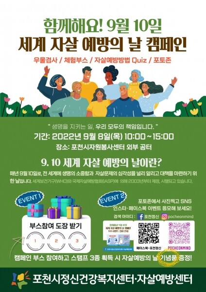 한편 포천시자살예방센터는 포천시민의 정신건강증진과 자살예방, 중증정신질환자들의 사회통합을 도모하는 다양한 지역사회정신건강사업을 수행한다.