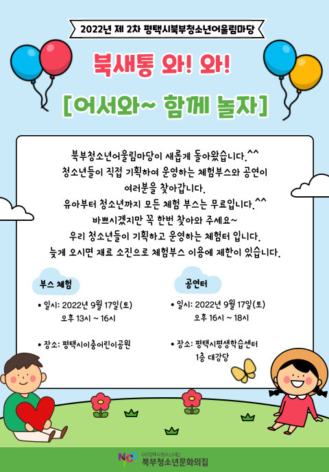 이번 2차 북부청소년어울림마당은 ‘북새통 와 와 [어서와~ 함께 놀자]’라는 주제로 다양한 체험부스와 공연으로 구성했으며 북부청소년문화의집 청소년행사기획동아리 ‘플랜잇’과 서정청소년문화의집 서정문화기획단이 협동해 운영한다.