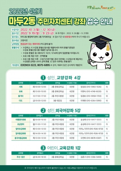 마두2동 주민자치센터 문화강좌 접수는 9월 19일부터 9월 23일 매일 오전 10시부터 오후 5시까지 마두2동 행정복지센터 2층에서 선착순으로 실시한다.