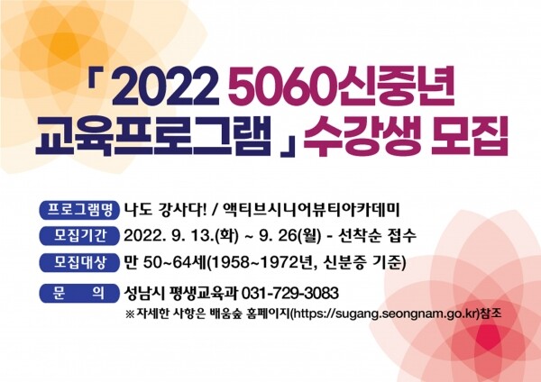 수강하려면 9월 13일~26일 성남시 평생학습 통합플랫폼 배움숲을 접속해 온라인 신청하면 된다.