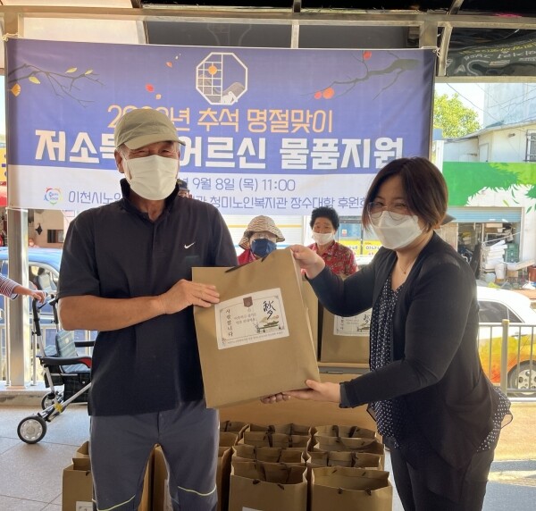 이날 행사를 통해 이천시 남부권에 거주하는 저소득층 어르신 45명에게 송편과 식혜, 라면 등의 물품을 전달해 행복한 한가위를 보낼 수 있도록 지원했다.