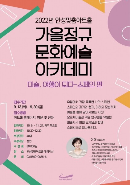 스페인을 깊게 들여다보는 이번 강좌는 성인 대상 프로그램으로 9월 13일부터 9월 30일까지 수강생 40명을 모집한다.