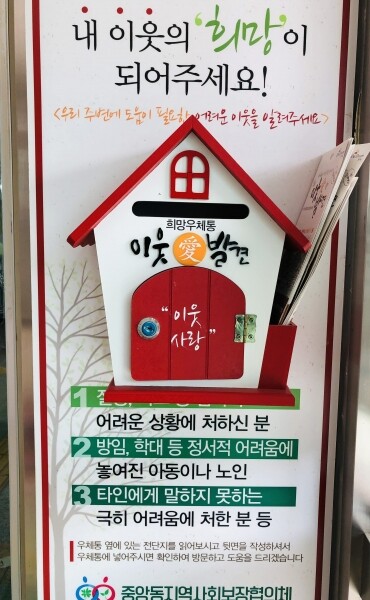 희망우체통은 복지 위기에 놓인 주민 본인 또는 주변 이웃이 메모나 편지글을 통해 도움을 요청하거나 제보할 수 있고 중앙동 지역사회보장협의체에서는 복지 지원이 필요한 해당 가정에 방문해 파악된 욕구 해소에 필요한 특화사업을 제공하게 된다.