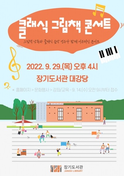 공연 신청은 9월 14일 수요일 오전 9시부터 장기도서관 홈페이지에서 온라인으로 이루어지며 선착순 100명을 모집한다.