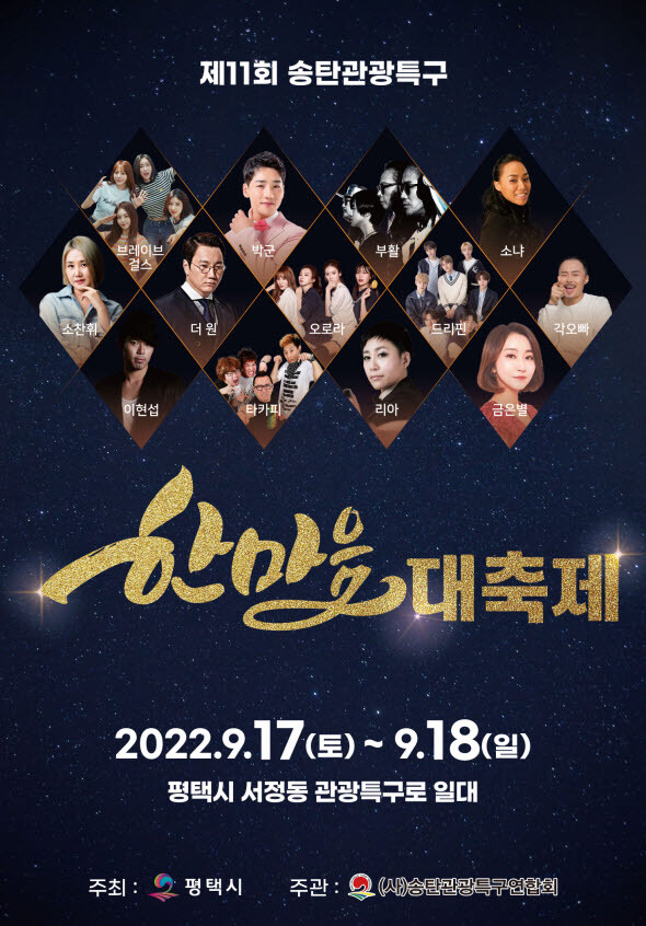 정장선 평택시장은 “코로나19로 인해 3년만에 개최되는 송탄관광특구 한마음 대축제가 성공적으로 개최될 수 있도록 힘써주신 송탄관광특구연합회 관계자 모든 분들께 감사드린다”며 “한마음 대축제가 지역사회에 활력소가 될 수 있는 시민 화합의 장이 되기를 기원한다”고 말했다.