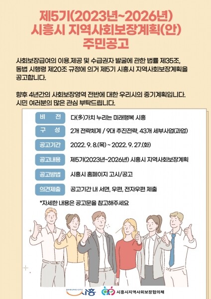 시흥시는 지난 1여 년간 제5기 지역사회보장조사 계획 수립 민-관-학 T/F팀 구성·운영 지역주민 및 민·관 관련분야 종사자 대상 포커스 그룹 인터뷰 등을 통해 지역사회 내 다양한 사회보장 욕구를 파악하고 제5기 목표와 전략, 세부사업 목록을 도출했다.