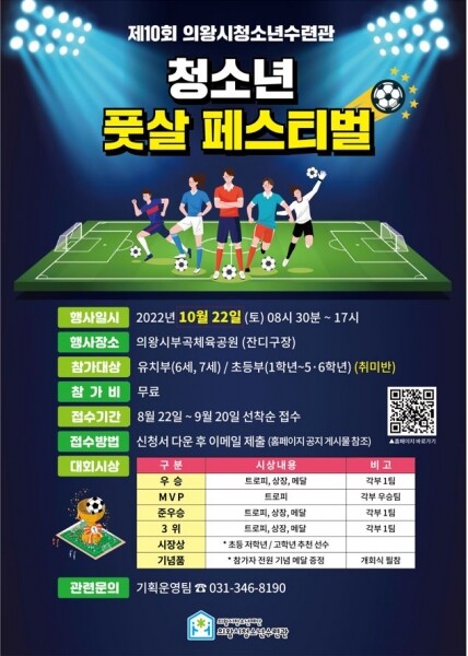 청소년들의 균형 있는 성장과 신체단련에 기여하고자 의왕시청소년수련관에서 마련한 이번 청소년 풋살대회는 행사 당일 모든 참가팀에게 기념 메달을 증정하고 우승팀에게 트로피를 시상할 예정이다.