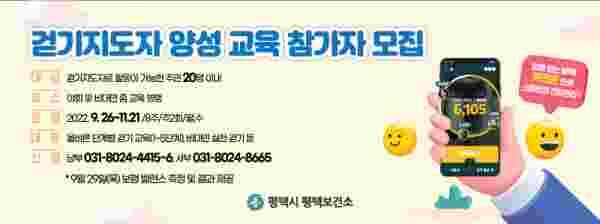 일상생활 속 걷기 활성화를 위해 걷기지도자들의 인적자원을 지속적으로 양성 교육함으로써 함께 걷는 평택을 만들고 주민 만보 걷기 캠페인을 전개해 건강생활 실천 분위기를 조성하기 위해 실시한다.