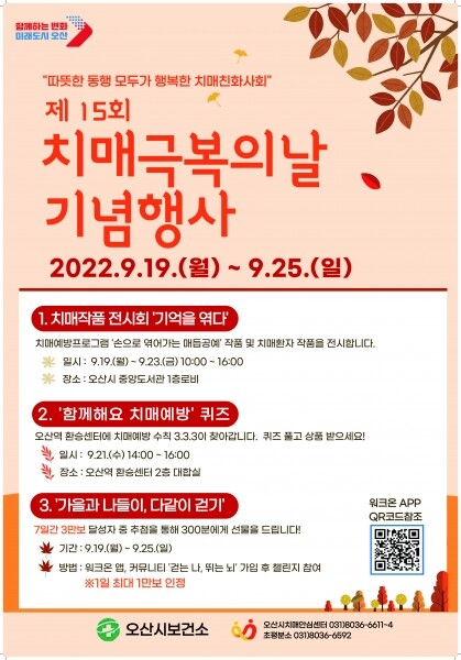 이번 행사는 중앙도서관 1층 로비 전시관에서 치매예방 및 쉼터 프로그램 작품을 전시하는 ‘기억을 엮다’전시회 오산역 환승센터 2층에서 치매예방 수칙 3.3.3을 배우고 직접 퀴즈를 풀며 치매 예방수칙 실천을 다짐하는‘함께 해요 치매예방’퀴즈 워크온 앱 오산시치매안심센터 커뮤니티‘걷는 나 뛰는 뇌’를 활용한 걷기 챌린지‘가을과 나들이, 다같이’기타 페이스북·밴드·SNS 등 각종 매체를 활용한 치매 예방 홍보 등 다양한 캠페인을 진행된다.
