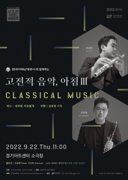 ‘고전적 음악, 아침’ 공연 시리즈는 클래식 연주와 해설이 함께하는 공연으로 9월 무대에는 플루티스트 조성현과 클라리네티스트 조인혁이 무대에 올라 GGAC 챔버 오케스트라와 함께 연주를 선보인다.